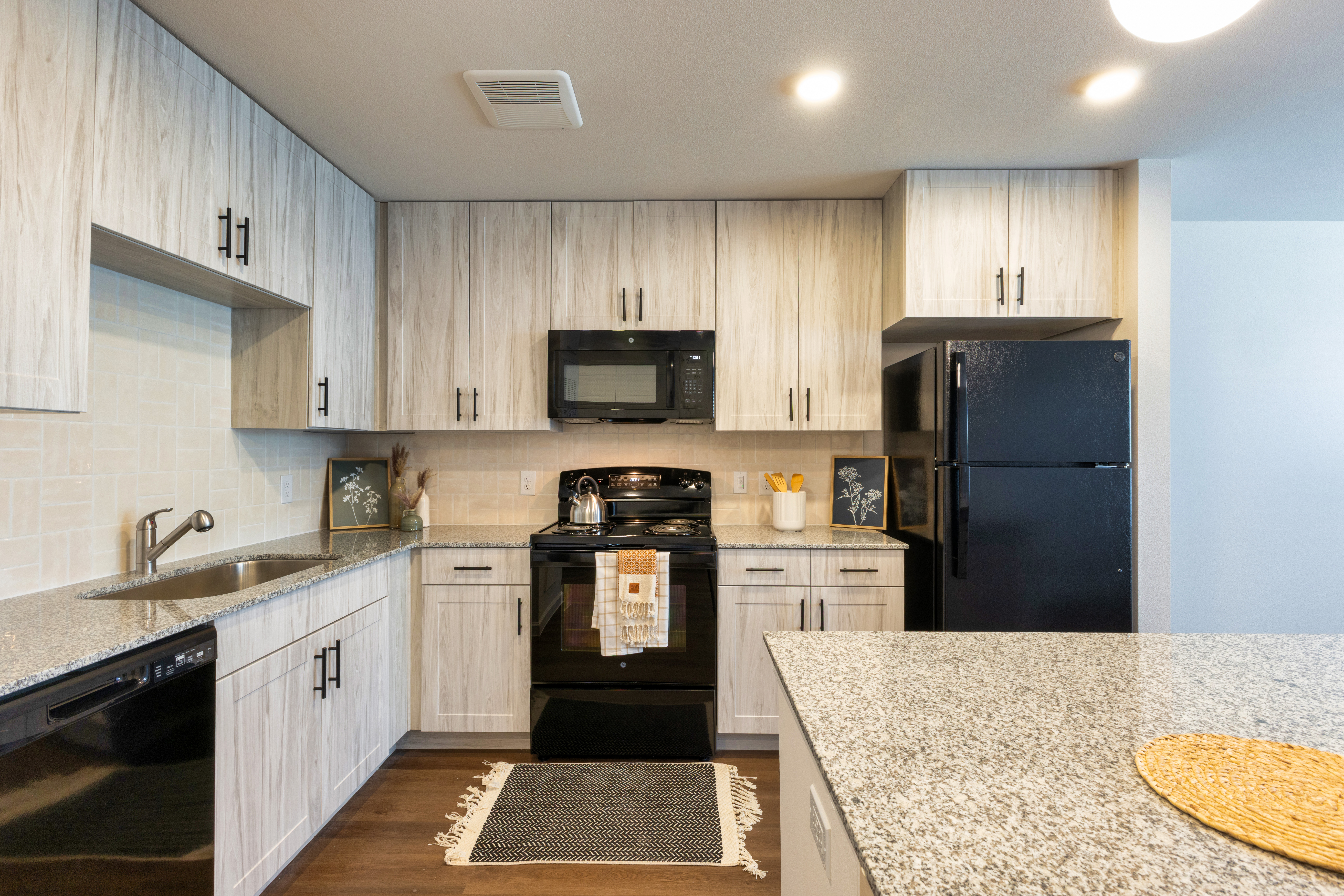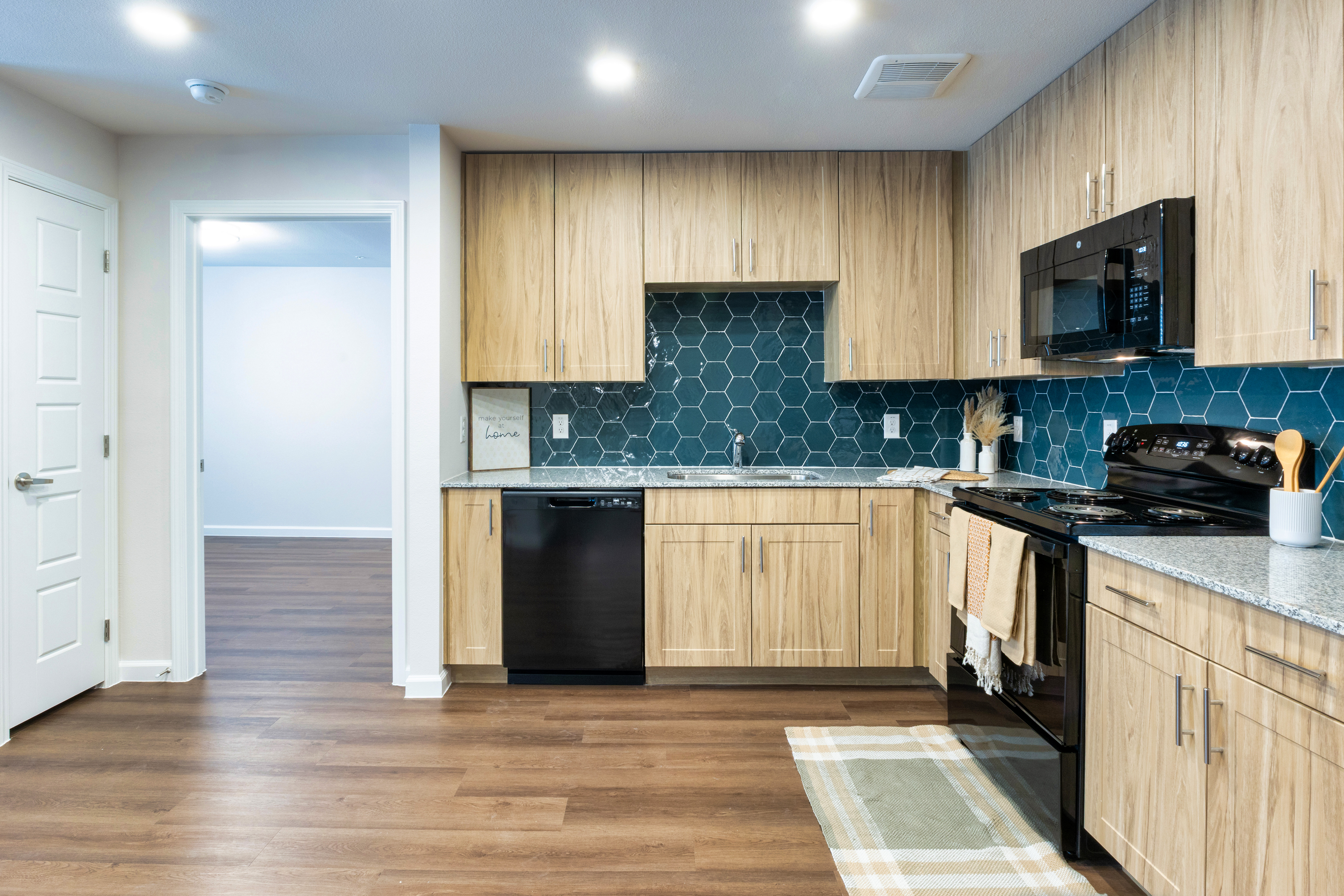 Units feature high-efficiency appliances and lighting, tiled tub surrounds and kitchen backsplashes, solid surface counters and resilient flooring.