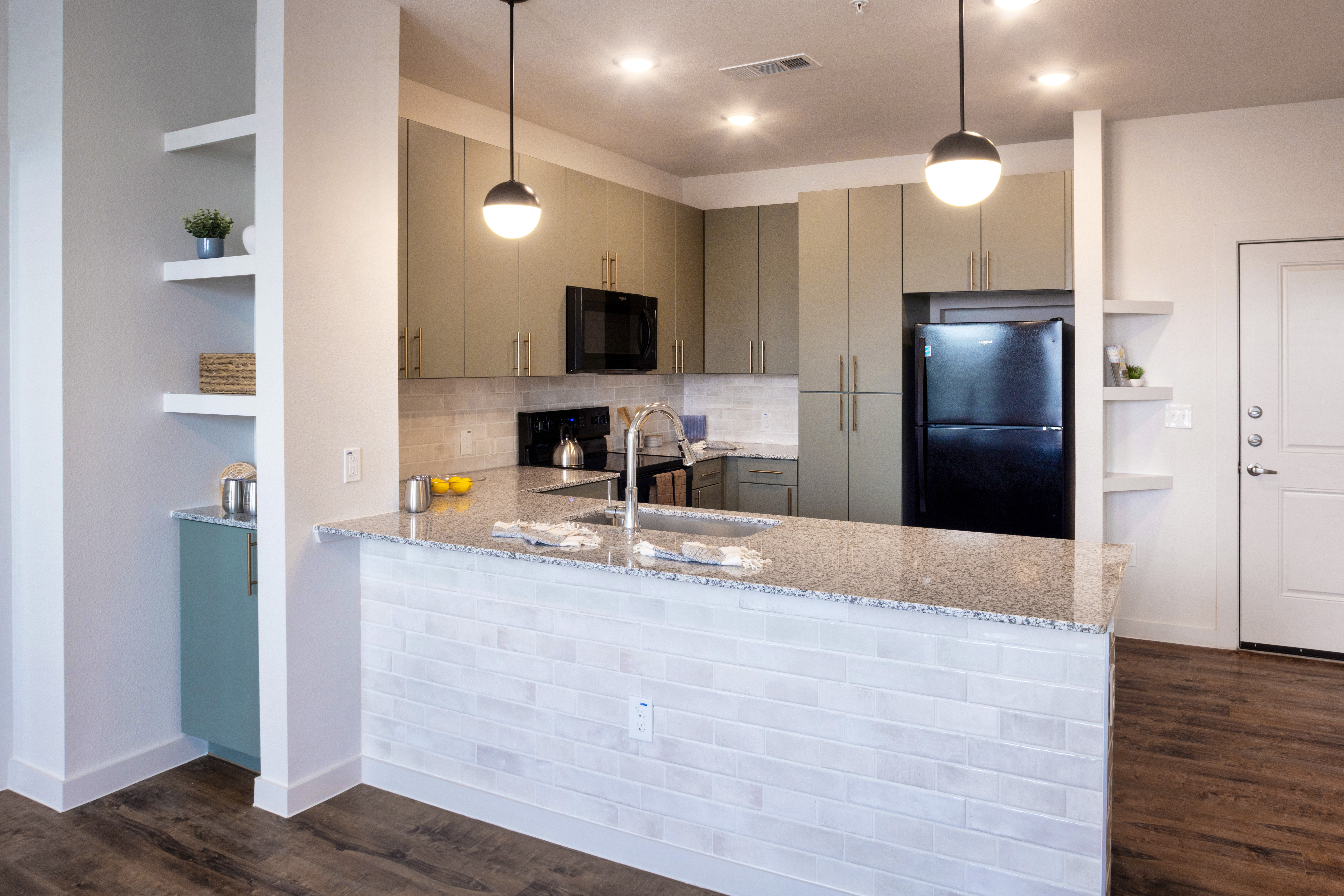 Units feature high efficiency appliances and lighting, tiled tub surrounds and kitchen backsplashes, solid surface counters and resilient flooring.
